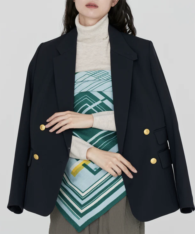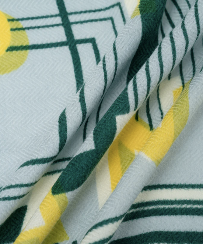 ウール60%・シルク40%の特注生地はすべてインド製で、プリントもシルクスカーフと同じ技法を用い、職人が1枚ずつ丁寧に手捺染しています。
