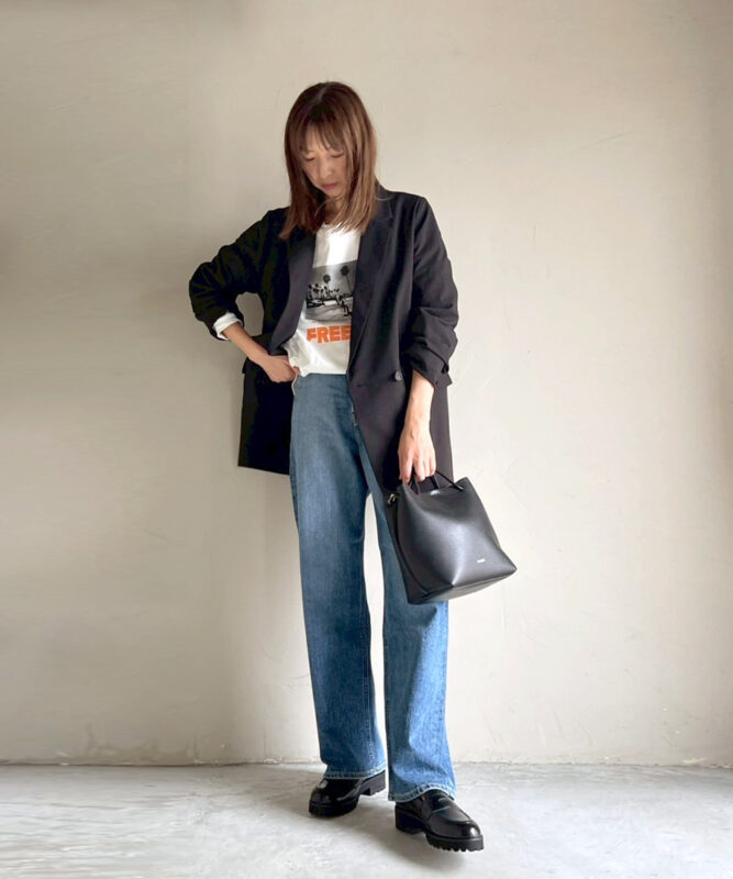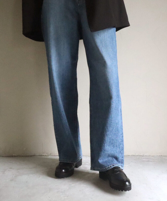 太ももから裾にかけて太さのあるストレートシルエット。あえて股ぐりを深く、後ろポケットやヨーク幅を広めに設定し、メンズライクな雰囲気に仕上げています。ウエストは女性に合うジャストサイズで、ずれ落ちることなく快適な穿きごこち。ボリューム感はありつつも、ヒップからすとんと落ちるラインで、後ろ姿もすっきり。体型を選ばず、脚のラインを気にせず穿ける一本です。