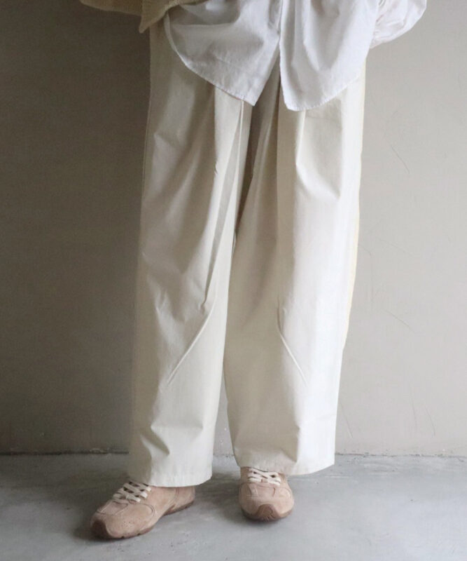 綿のナチュラルな表情と、ポリエステルナイロン割繊糸ならではのふくらみある風合いが魅力の一本。VC-2379をベースに生地を変更して仕立てました。ウエストはタックを入れて腰まわりにゆとりを持たせ、裾にかけて緩やかに細くなるテーパードシルエット。ゴムと紐で調整できるイージー仕様で、リラックスした穿き心地を叶えます。