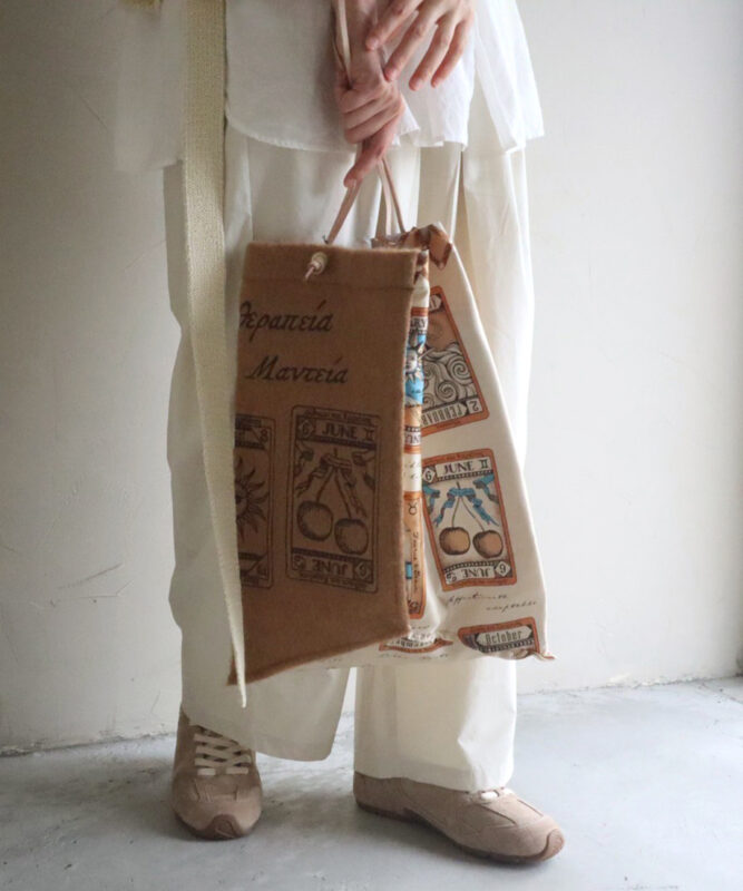 シルクスカーフと異素材を組み合わせた刺繍入りトートバッグ。サイドに付いたハンドルによって、持ったときに三角形のシルエットが生まれるユニークなデザインです。A4サイズが収まる大きさで、角度によって表情が変わるのも魅力。通勤・通学から休日のお出かけまで、幅広いシーンで活躍する人気アイテムです。