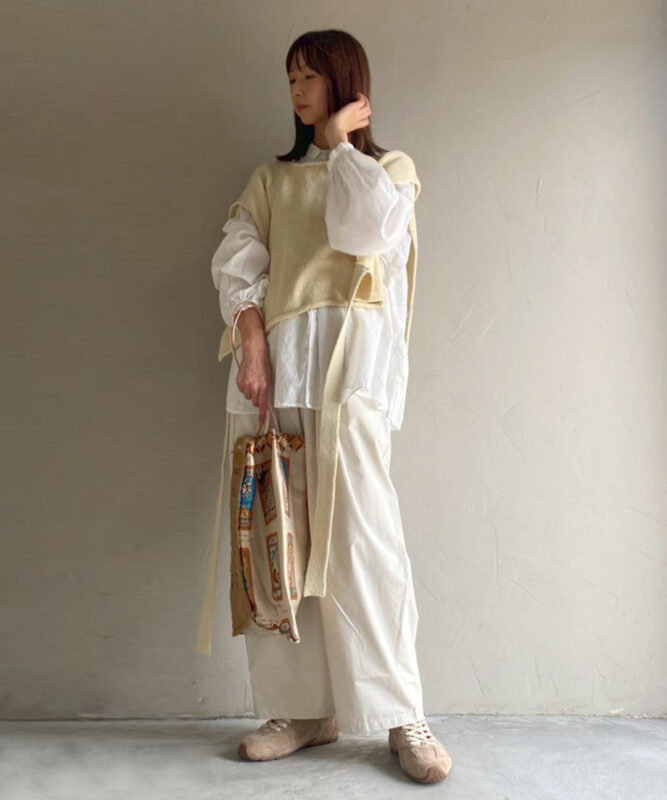 アンティークブラウスにニットベストを重ねた、クラシカルで温もりのあるスタイリング。繊細なディテールと柔らかなニットの質感が調和し、秋らしい上品な雰囲気を演出します。