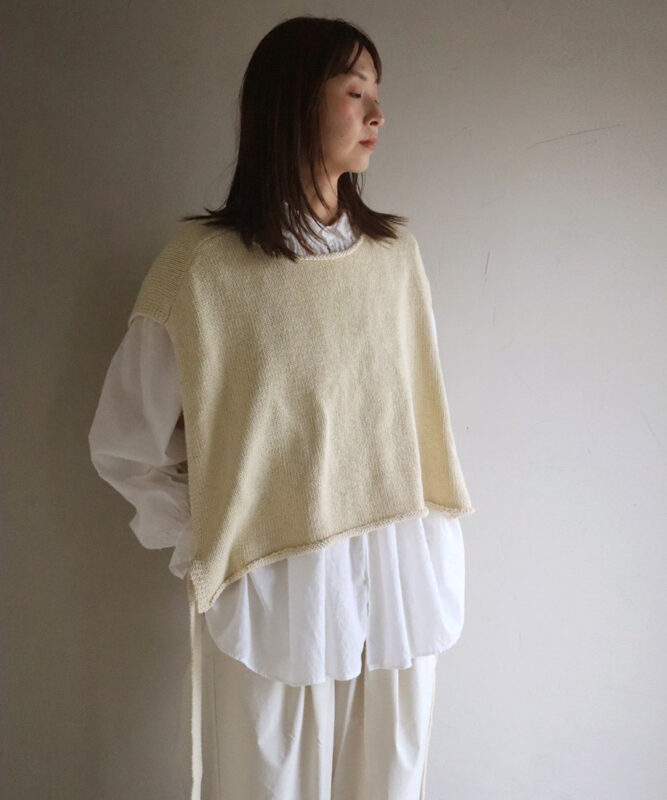 コットン100%の糸にシルケット加工を施し、毛羽立ちを抑えて上品な光沢を表現したニットベスト。ナチュラルなクラフト感と洗練された雰囲気を兼ね備えています。前後どちらでも着用できる2WAY仕様。