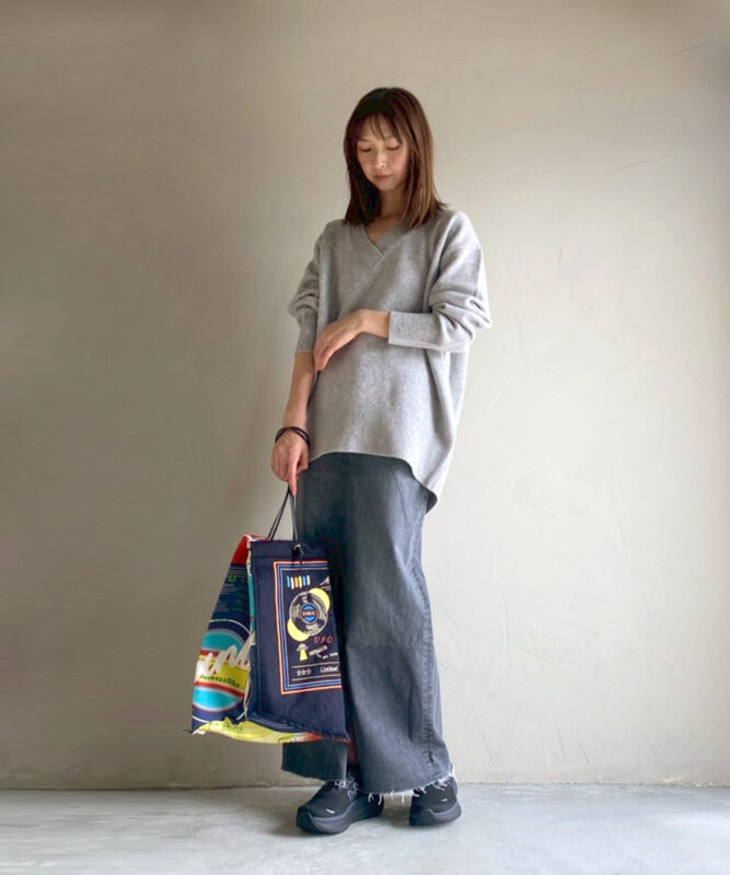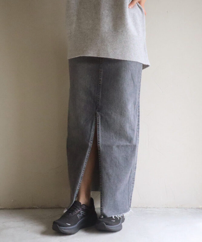 Iラインシルエットのロングスカート。腰回りはフィットしつつ裾にかけてまっすぐ落ちるラインで、前スリットが抜け感と動きやすさをプラス。縦長効果で脚をすらりと見せ、クロップドトップスとの相性も◎。程よいムラ感のブラックデニムがカジュアルすぎず、USEDグレーカラーが大人の抜け感を演出します。裾のカットオフがアクセントになり、足元コーデも楽しめる一着。