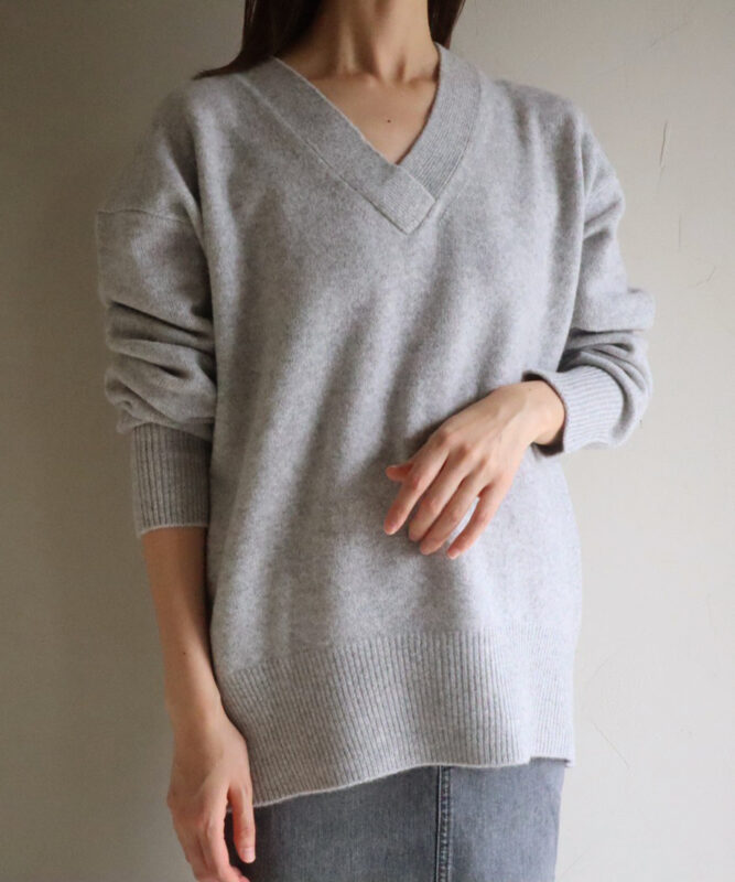 ウルトラファインメリノにカシミヤをブレンドした、柔らかく温かみのあるプルオーバー。前後差のある丈感でバランスよく着こなせ、重ねVネックと後ろ裾のスリットが女性らしさをプラス。上品で実用的、デイリーにも活躍する万能ニットです。