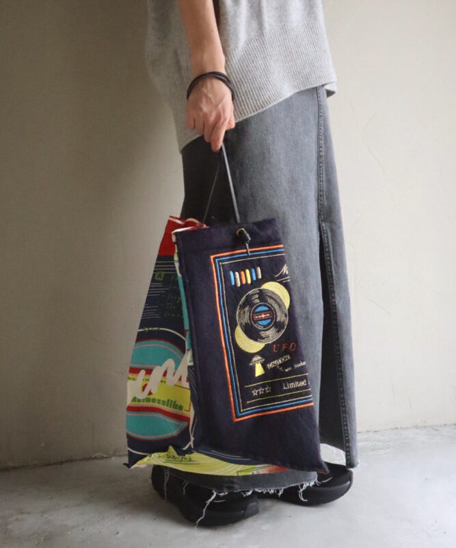 シルクスカーフと異素材を組み合わせた刺繍入りトートバッグ。サイドに付いたハンドルによって、持ったときに三角形のシルエットが生まれるユニークなデザインです。A4サイズが収まる大きさで、角度によって表情が変わるのも魅力。通勤・通学から休日のお出かけまで、幅広いシーンで活躍する人気アイテムです。