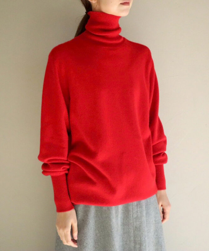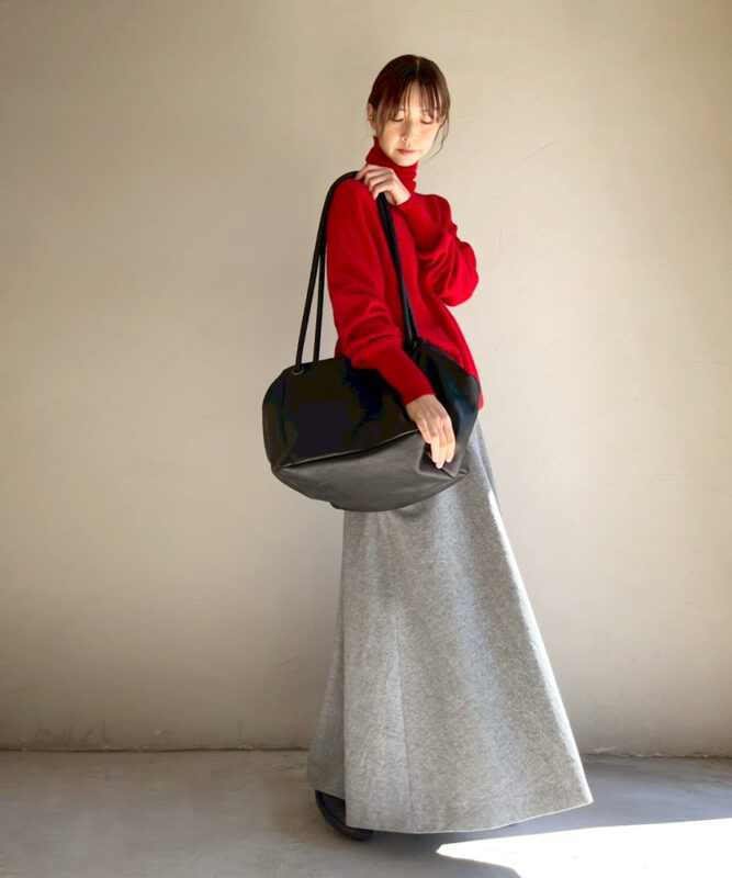 鮮やかな赤が映えるカシミヤセーターに、上質なウール100%のグレーのロングスカートを合わせたコーデ。シンプルながら素材の良さが引き立つ、上品で洗練されたスタイルです。