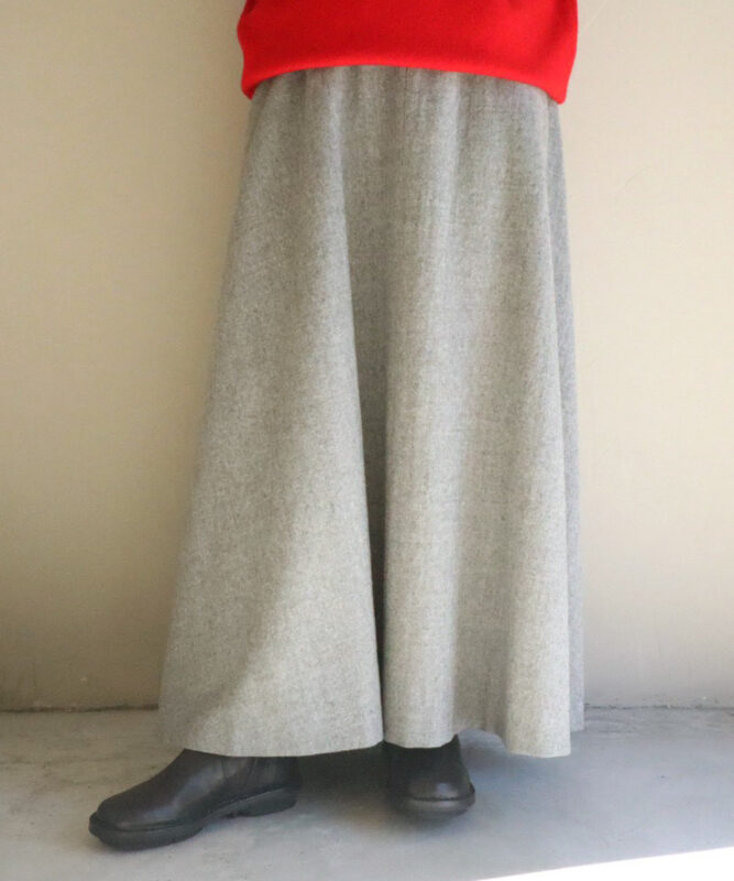 上質なウール100%素材を使用したロングスカート。自然な落ち感とあたたかみのある風合いが魅力です。ウエストは隠しジッパーとドローストリング仕様で、きれいめな印象の中にもリラックスした着心地を実現。シーズンムードを高める上品な一枚。