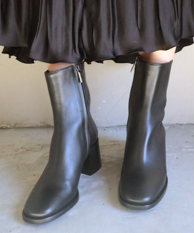 柔らかく上質なレザーを使用したスクエアトゥのショートブーツです。サイドジップで楽に着脱することができます。インソールはクッション性があり長時間履いても疲れにくく、ソフトなレザーを使用しているので足馴染みも良いです。