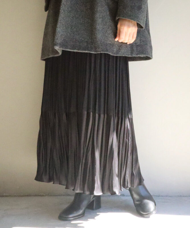 異素材を組み合わせた奥行きのあるプリーツスカート。光沢の異なる生地が生み出す立体感と陰影が美しく、動くたびに上品な揺れを演出します。細かなプリーツからランダムな広幅プリーツへの切り替えで、広がりすぎないすっきりとしたシルエットに。