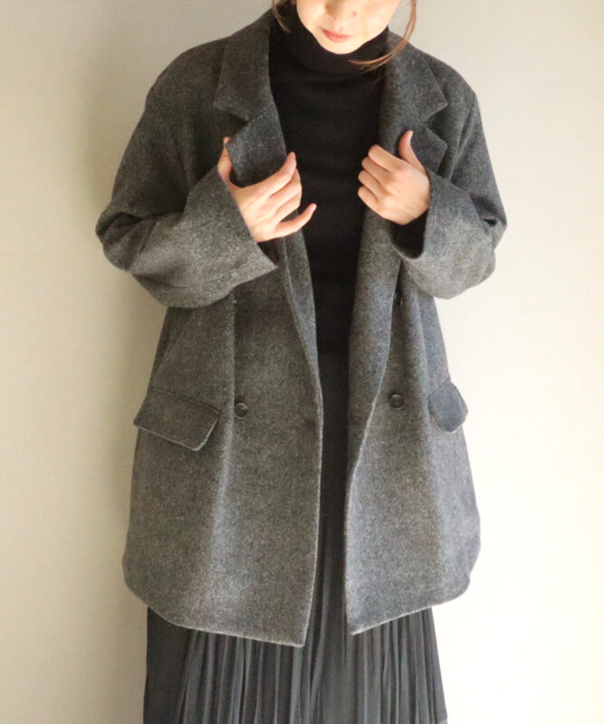 コートのような温もりを感じるダブルブレストのツイードジャケット。大きめのラペルとゆったりとしたビッグシルエットが特徴で、ザックリ羽織るだけでこなれた印象に。ヒップが隠れる長めの丈とバックスリット入りで、動きやすさも◎。ボタンを留めずラフに着こなしても様になります。