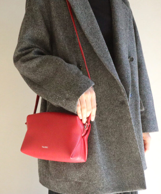 SOFT SHRINK レザーを使用したクロスボディバッグ。すっきりとしたフォルムに両サイドの縫製がアクセントを添える、ミニマルながら個性のあるデザイン。シボ感のある床革を用いることで軽量性と上質感を両立。コンパクトながらスマートフォンやミニ財布、鍵などがしっかり収まり、使い勝手も抜群です。長さ調節可能なストラップで肩掛けも斜めがけも可能。
