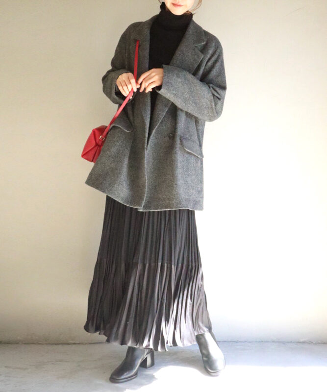 異素材を組み合わせて奥行きを生んだプリーツスカートに、ダブルブレストのツイードジャケットを合わせた上品なスタイル。スカートの揺れ感がツイードの重厚さを軽やかに引き立て、女性らしさとクラシックなムードが絶妙に調和します。