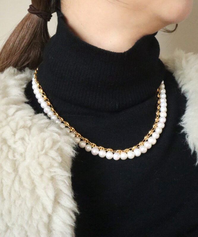 チェーンネックレス。シンプルながら程よい存在感で、どんなコーデにもなじむ万能アイテム。Tシャツやシャツにさらっと合わせるだけで、スタイリングのアクセントに。Tバーは前後どちらにしても楽しめ、スタイリングに合わせてアレンジ自在。重ね付けにもぴったりな一本です。