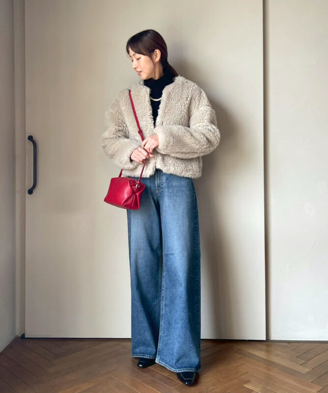 ウールファーショートコートにルーズバギーを合わせた、ボリューム×リラックス感が今っぽいコーデ。ショート丈アウターが重心を上げ、バギーのワイドシルエットをバランスよく引き立てます。