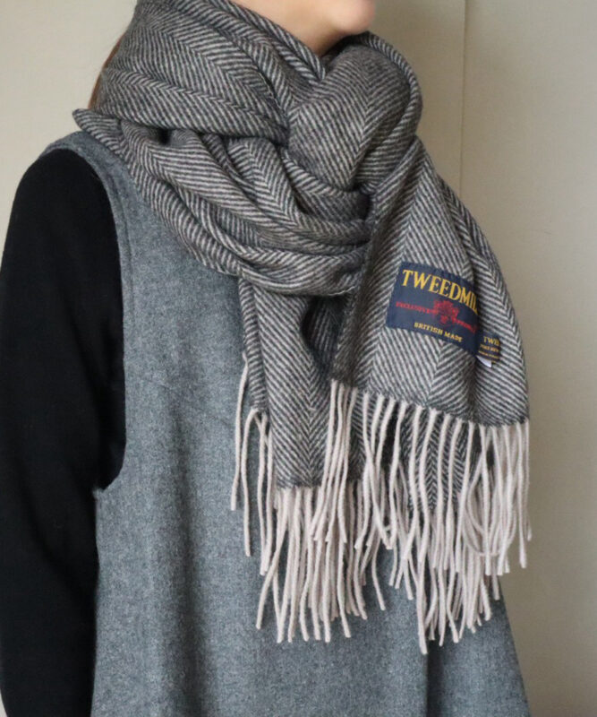 ストールとフェイクムートンのリバーシブルトートを主役にしたコーデは、シンプルな装いに季節感と奥行きをプラスするのがポイント。
