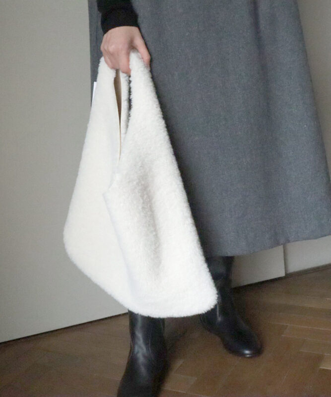 フェイクムートンのリバーシブルトート。ふかふかのエコムートンが季節感を添え、普段使いしやすいサイズ感。裏返せばスエード調でマットな雰囲気に。1つで2通り楽しめる冬の万能バッグです。