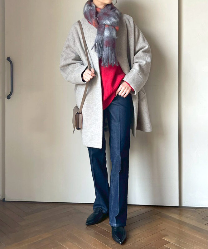 グレーのテントコートにデニムを合わせ、赤ニットとチェックストールで差し色を効かせた、冬らしい大人カジュアルコーデ。