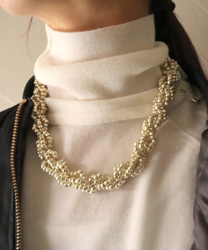 ガラスビーズを通し、ひねりを加えたような立体感のあるデザインが印象的なチョーカータイプのネックレス。繊細ながらも存在感があり、首元にさりげないアクセントを添えてくれます。シルバーは、上品な輝きでコーディネートを華やかに演出。デイリー使いはもちろん、パーティーやフォーマルなど様々なオケージョンにも合わせやすいのが魅力です。