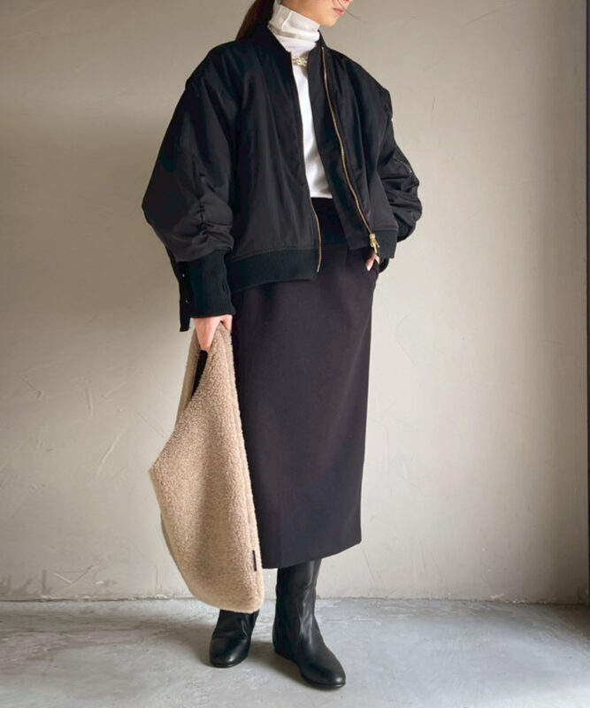 ショートブルゾンにタイトスカートを合わせた、バランスの良い大人カジュアルスタイル。コンパクトな丈感のショートブルゾンが視線を上に引き上げ、タイトスカートの縦ラインをより強調。すっきりとしたIラインが生まれ、自然とスタイルアップします。