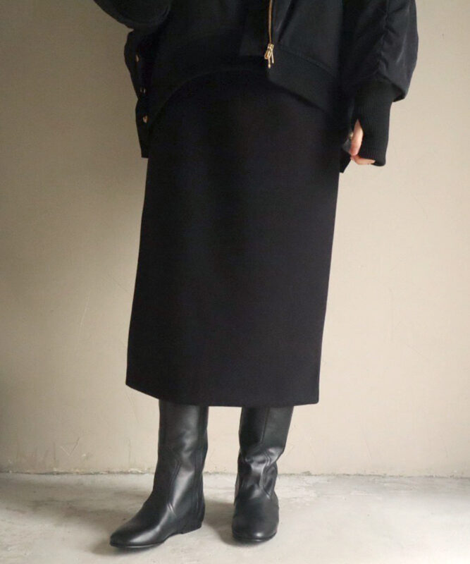 メルトンジャージータイトスカート。厚手で表面に起毛を施したメルトンジャージ素材を使用し、あたたかさと上品な風合いを兼ね備えた一着。縦のラインを強調するIラインシルエットで、すっきりとした印象に穿きこなせます。ウエストは総ゴム仕様で、締め付け感のないストレスフリーな穿き心地。両サイドに2つ、バックに2つの計4ポケットを備え、実用性とデザイン性の両方を叶えました。ゆったりとした身幅ながらも美しい縦長シルエットをキープし、バックスリット入りで足さばきも良好。