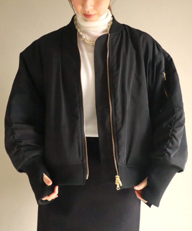 ポンチョとMA-1を掛け合わせたようなデザインが目を惹く、裏キルティング仕様のショートブルゾン。肩のラインを落としたドロップショルダーに、たっぷりとボリュームを持たせた袖が、さっと羽織るだけでこなれた印象を演出します。裾にはドローストリングを配し、絞り具合でシルエットのアレンジも自在。スカートにもパンツにもバランスよく合わせやすい丈感で、幅広いスタイリングに活躍します。