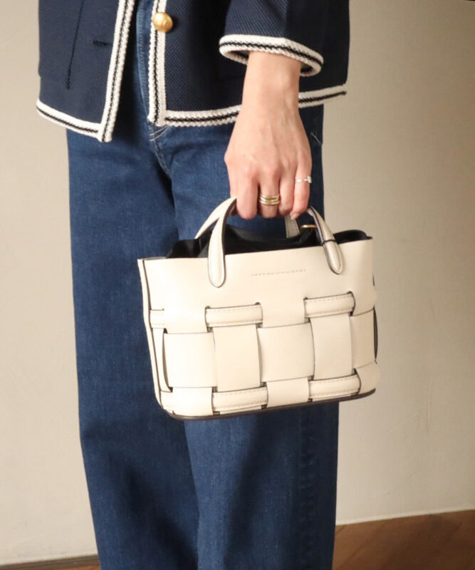 イントレチャートにクラフト感をプラスした、存在感のあるバッグ。盛り芯入りの帯とワイド幅の帯を通すことで、デコラティブで印象的なデザインに。裏地なしのラフな作りながら、綿麻帆布の巾着付きで実用性も◎。取り外し可能なナイロンショルダーは、インパクトのあるワイド幅で、見た目のバランスも新鮮です。