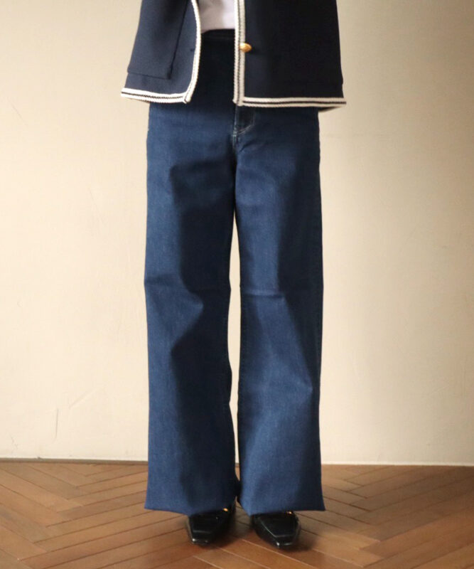 脚長効果が叶う、美しいシルエットのフレアデニム。腰まわりはすっきりとフィットし、裾に向かってゆるやかに広がるラインがスタイルアップを演出します。ほどよいボリューム感がありながらも、だらしなく見えず上品に穿ける一本。ヒールとの相性も良く、バランスよく着こなせます。