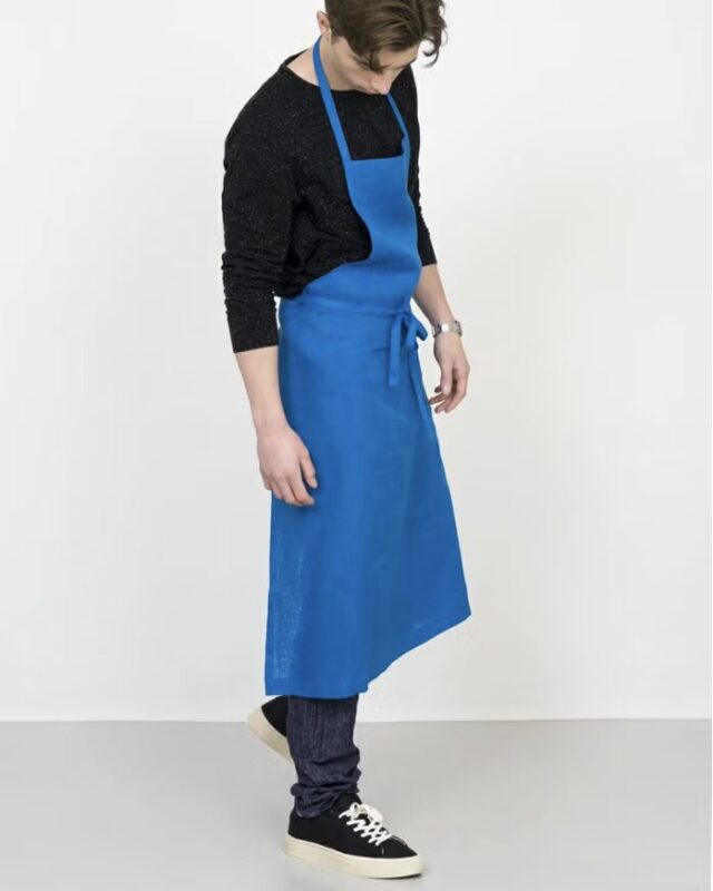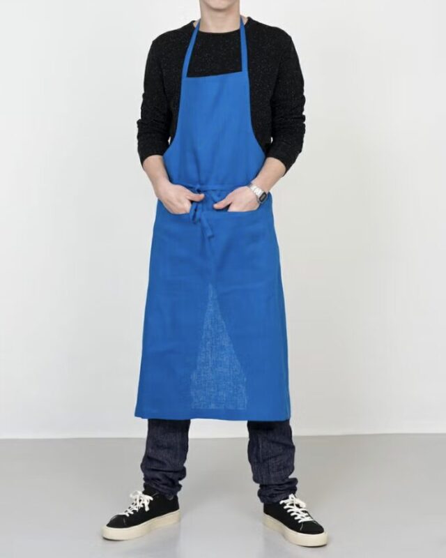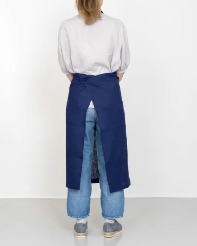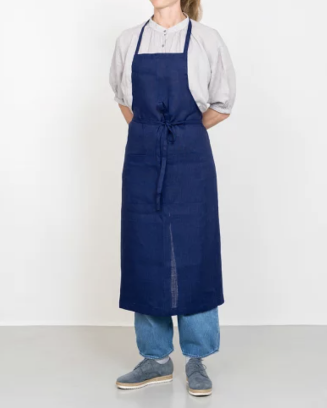 fogの定番、シンプルな形のリネンフルエプロン。たっぷりとした丈なので全身をカバーしてくれます。