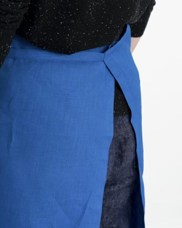 胸当ての部分を内側におりこむと、サロンエプロン風にも使えます。胸元にはテープのフックが付いているので、キッチンに気軽に掛けておけるのも便利です。