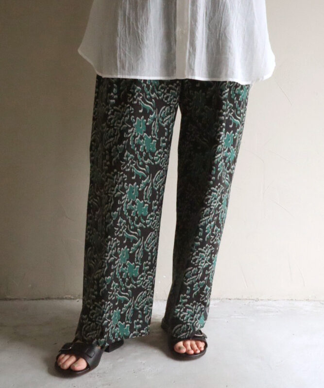 経にリネン、緯に自然なムラ感のあるコットンを2本取りで綾織りに仕上げた生地を使用。しっかりとした厚みがあり、単色ながらも奥行きのある表情が魅力。裾に向かってすっきりとしたシルエットのパンツは着回し力が高く、幅広いコーディネートに合います。