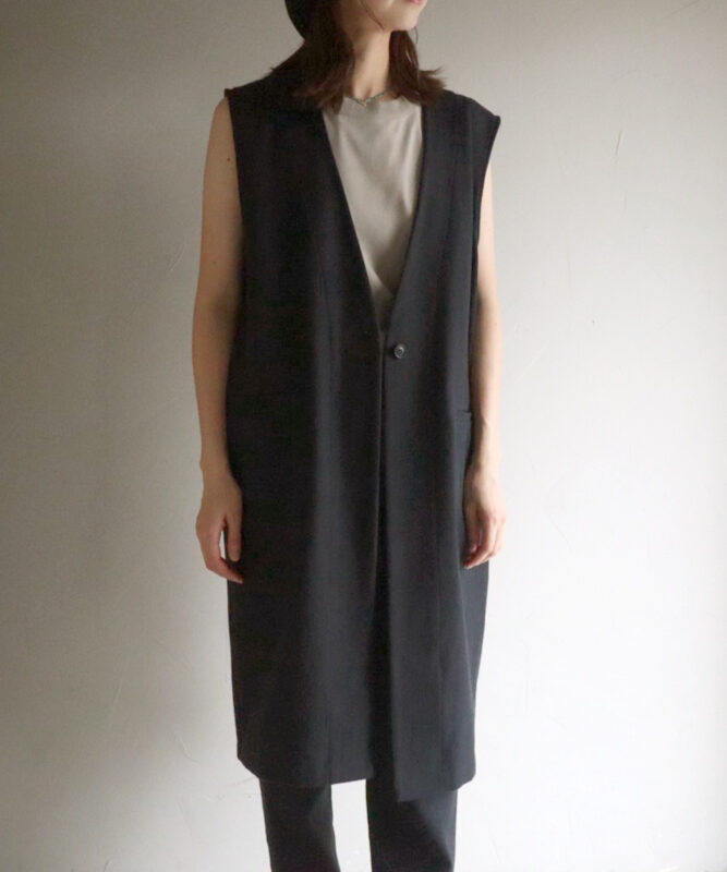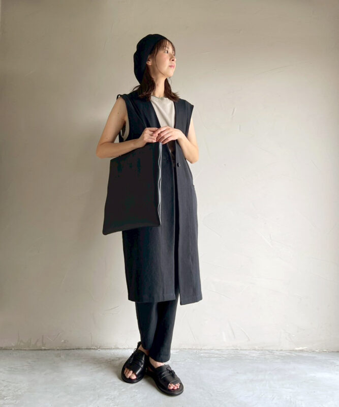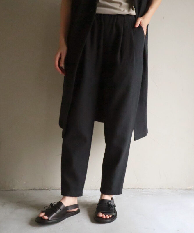 経にリネン、緯に自然なムラ感のあるコットンを2本取りで綾織りした生地を使用。厚みがありながら単色でも奥行きのある表情が魅力です。春のコーデを引き締めるロングベストや、季節の変わり目から活躍するベーシックパンツを展開。ロングベストはパンツはもちろん、ワンピースとのレイヤードにもおすすめ。