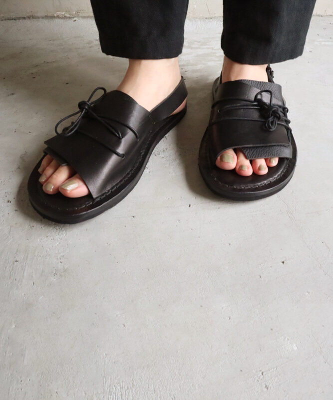 TrippenとPal Offnerのコラボによる、個性際立つレザーサンダル。非対称のレースアップに加え、金属製バックルがアクセントを添えます。フロントとバックは大胆にオープンに設計されており、抜け感と快適さを両立。滑らかなソールに加え、縁にはステッチが施され、クラフト感ある仕上がりに。モードな佇まいの中に、実用性と履き心地も兼ね備えた一足。