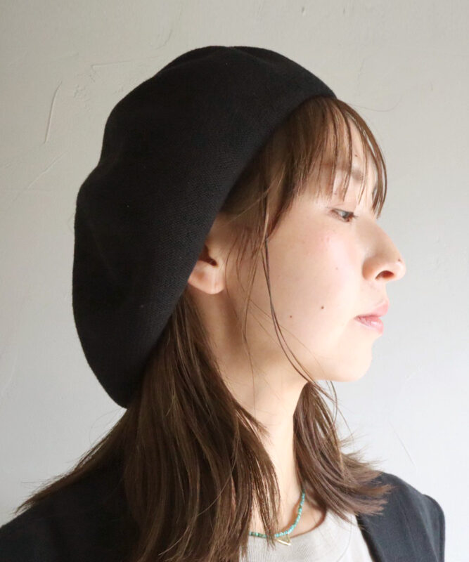 ややゆったりとしたサイズ感のベレー帽。綿糸に熱で固まるサーモ糸を混ぜて製作し春夏仕様に。シルエットの良さを追求し、天井のチョボさえも取り除いたデザイン。ユニセックスで使用でき、女性なら少し大きめに被りたい方におすすめのサイズ感です。