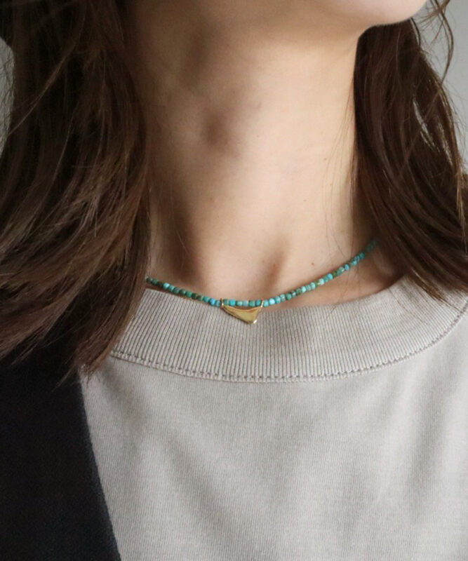 水に磨かれた石のような表情をもつFlowシリーズから、鮮やかなエメラルドグリーンのターコイズとゴールドを組み合わせたネックレス。首元に沿う上品な長さで、Tシャツやブラウスにも好相性。フックを前にして着けるアレンジも楽しめ、コーディネートに華やかなアクセントを添えてくれます。