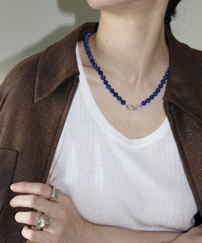 深みのあるブルーのラピスラズリと凹凸のあるフラットパーツを組み合わせた、表情豊かなネックレス。首元にすっきりと沿う短めの長さで、Tシャツやブラウスなど幅広いスタイルにマッチ。