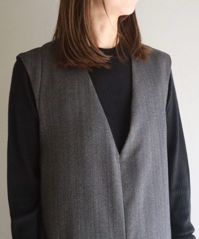 フェイクボア素材を使用した比翼仕立てのロングベスト。サイドポケットを備え、機能性も充実。裏地には配色のパイピングやボタンホールを取り入れ、ディテールまでこだわり抜いたデザインが魅力。
