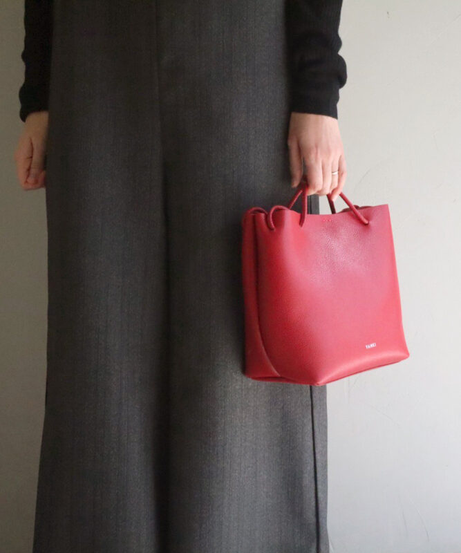 コロンとしたオーバルフォルムが印象的な、モダンな雰囲気のハンドトート。自立する安定感のあるデザインで、無造作に置くだけでも美しい佇まいを見せます。見た目はコンパクトながら、ペットボトルなども収まる実用性を備えており、デザイン性と機能性を兼ね備えた使い勝手の良いアイテムです。