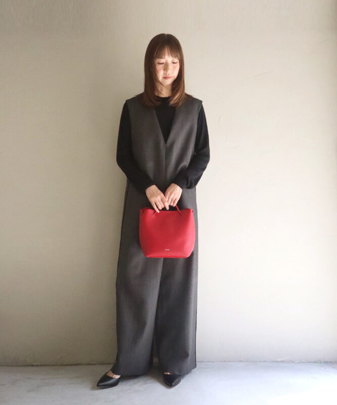 ワイドシルエットが映えるコンビネゾンに、レッドのバッグをアクセントに効かせたスタイル。 シンプルな装いに華やかさが加わり、女性らしい存在感を引き立てます。