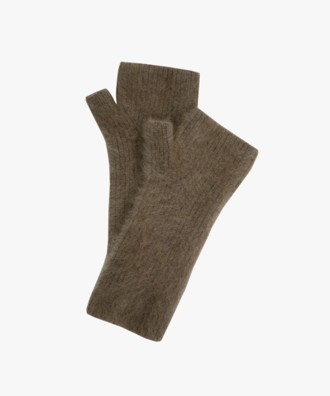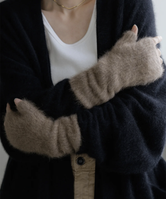 ふわふわの素材で手首を優しく包み込むアームウォーマー。指先が使える便利なデザインで、ラクーンの毛をブラッシングして採取した、とても軽くて暖かい希少素材を使用しています。